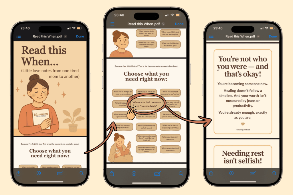 An interactive ebook with comforting notes you can click through based on how you feel. Plus, we’ll send you weekly tips, laughs, and ideas to make mom life a little lighter.